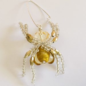 Christmas  spider decoration made from a variety of materials including copper wire, glass beads, wooden beads , and acrylic beads.