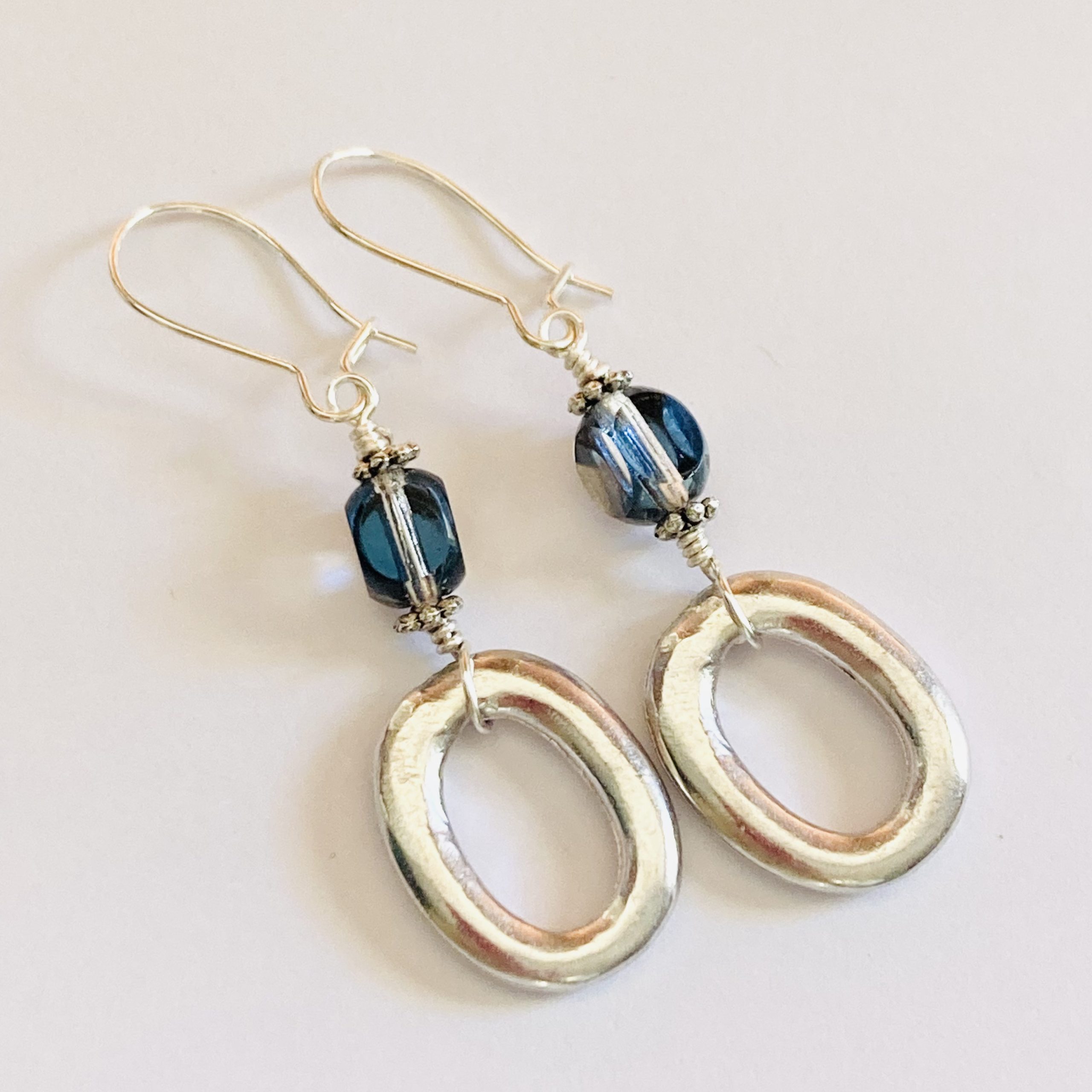 Silver tone oval links with blue crystal detail. Ear wires are silver plated.