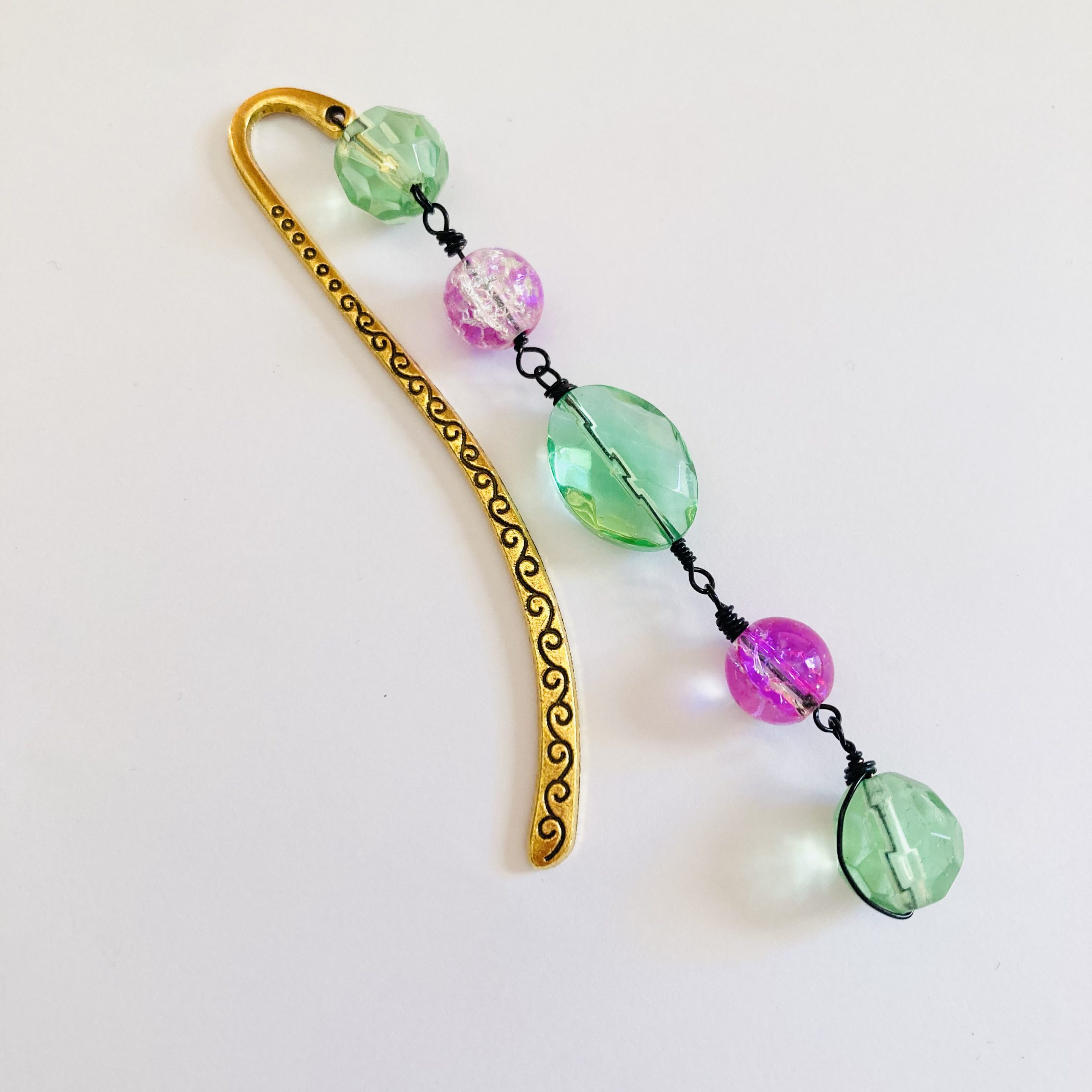 Metal bookmark with a mixture of wooden, acrylic, and glass beads.
