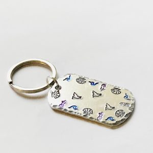 Aluminium key ring stamped with birds, shells, waves, and seahorses.